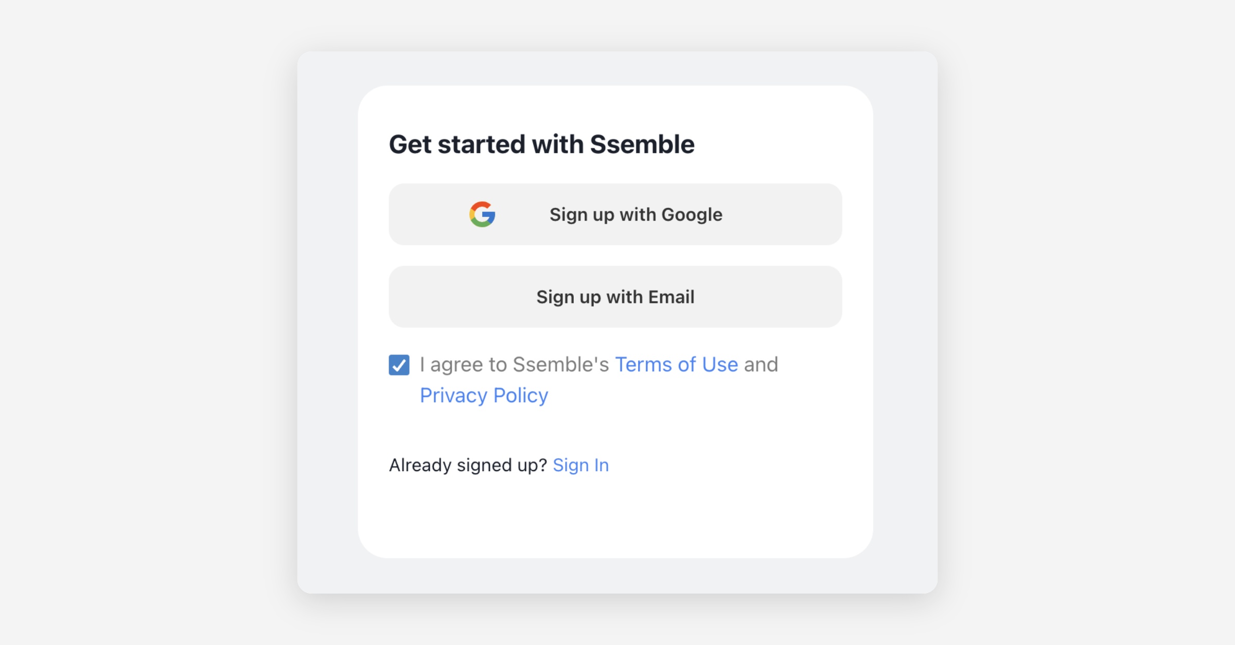 You can get started by signing up with your Google account or email at https://app.ssemble.com/signup