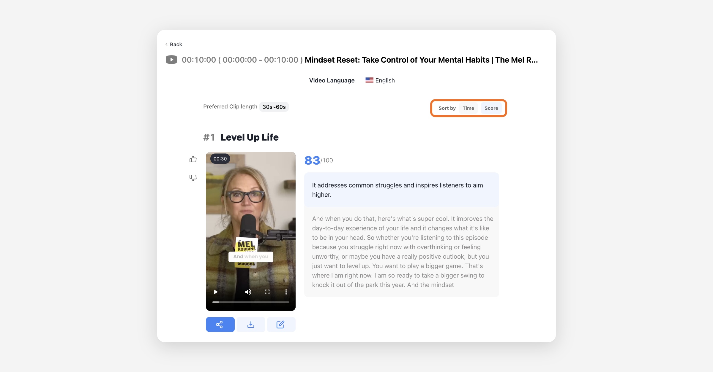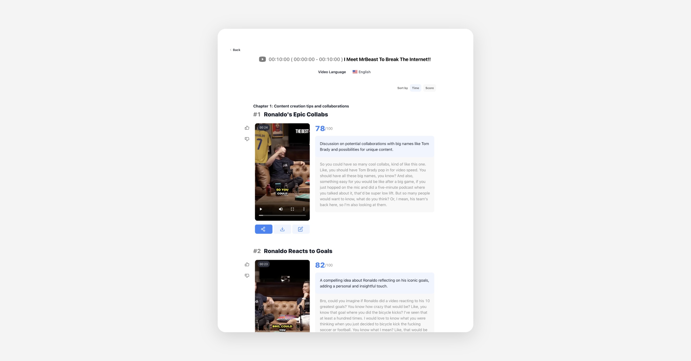 You can display the generated clips in chronological order (Time) or in order of highest viral score (Score).