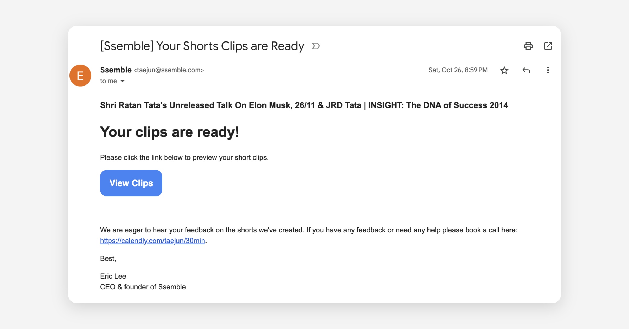 Generating a short can take as little as 3 minutes or as long as 30 minutes, depending on the length of the original footage and the options you select. When the short is complete, you'll receive a notification email like the one below.