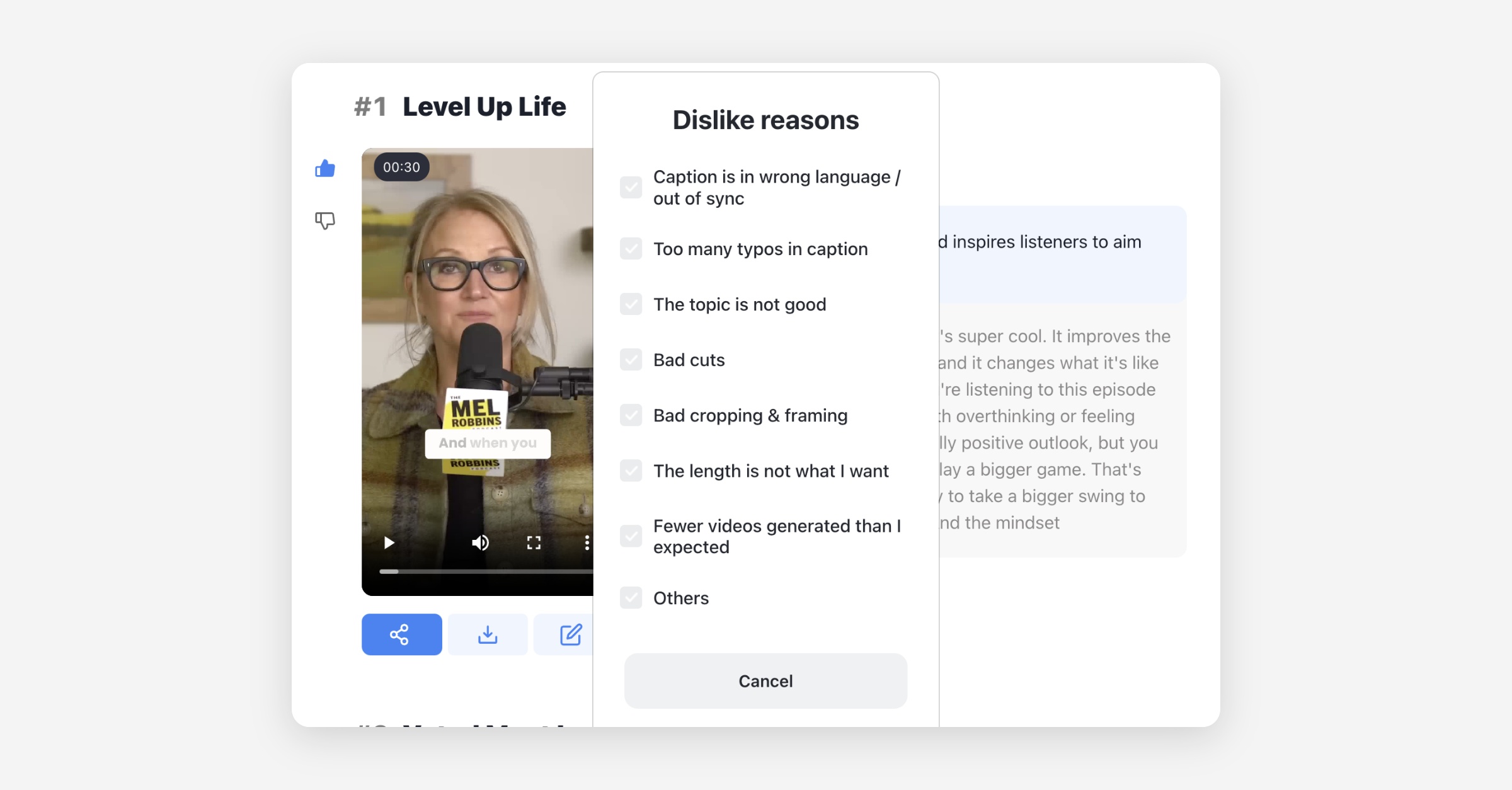 If you're not happy with how your clip turned out, you can edit it further by pressing the Edit button, or you can give us feedback. This feedback can help us further improve our clip generation algorithm.