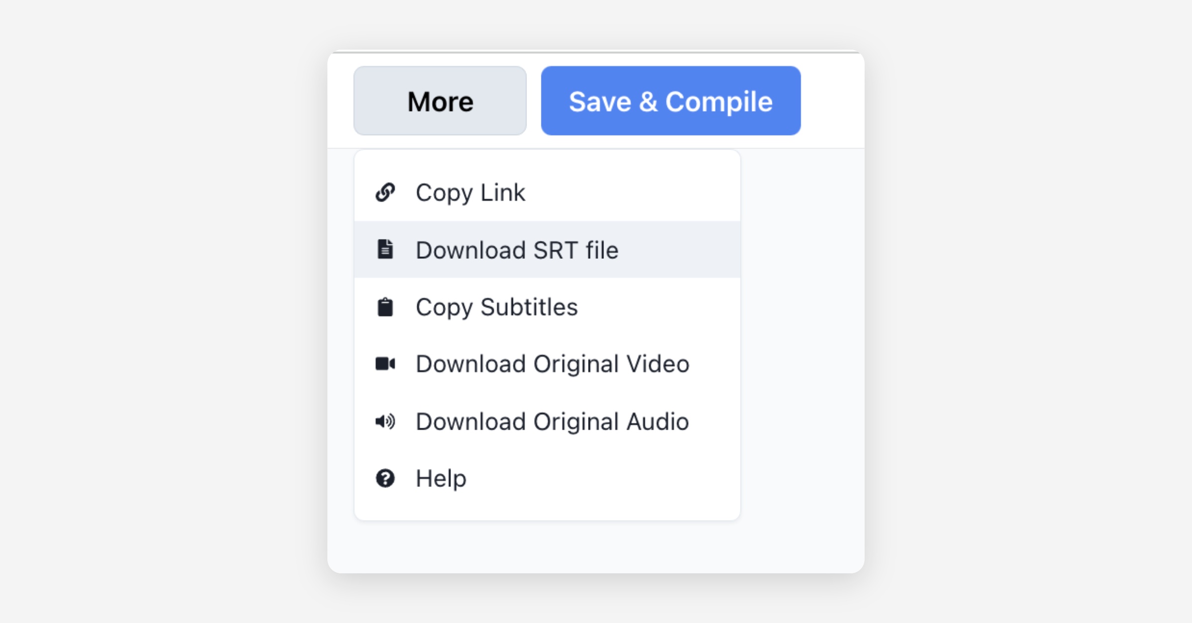 If you click the More button in the top right corner of the editor, you'll find the Download SRT button. Click it to download the subtitles as an SRT file. You can upload the SRT file to your YouTube video and edit it in the editor to improve your video's SEO.