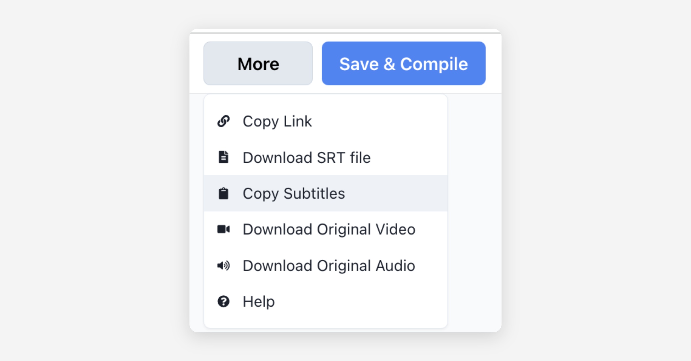 If you click the More button in the top right corner of the editor, you'll find the Copy Subtitles button. Click it to copy the entire subtitle content of the clip to the clipboard.